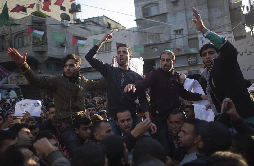 آلالاف المواطنين خرجوا في مسيره حاشدة في مخيم جباليا شمال قطاع غزه، بدعوه من الحراك الشبابي بعيدا عن التنظيمات السياسية، للمطالبة بتوفير الكهرباء للقطاع، وعدم تسيس الازمة والمعالجة الفورية للانقطاع الدائم للكهرباء.
