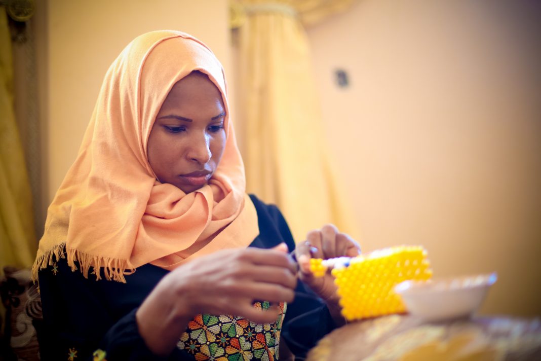 عويضة التي تسكن منطقة النصيرات وسط قطاع غزة، تعمل منذ عامٍ ونصف على مشروع صنع الإكسسوارات بالخيوط والخرز، بعد أن حوّلت موهبتها إلى مهنة، وهي في الوقت ذاته تتطوع ضمن مجلس إدارة الاتحاد الفلسطيني لذوي الإعاقة، لغاية تقديم خدمة مناسبةٍ لأقرانها.