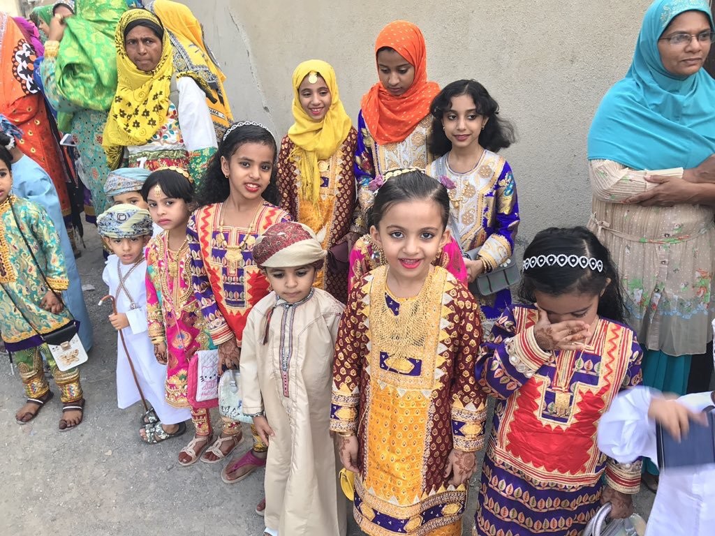 "كل عام وانتم طيبين عساكم من العايدين والفايزين"، هذه هي العبارة التي يتبادلها العمانيون والعُمانيات للتهنئة بالعيد، الذي تبدأ الاستعدادات له قبل شهر كامل، وتستمر لأربعة أيام في العيد، كل يوم بطقوس مختلفة.