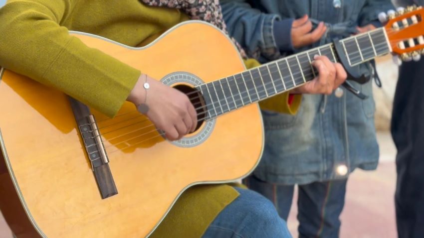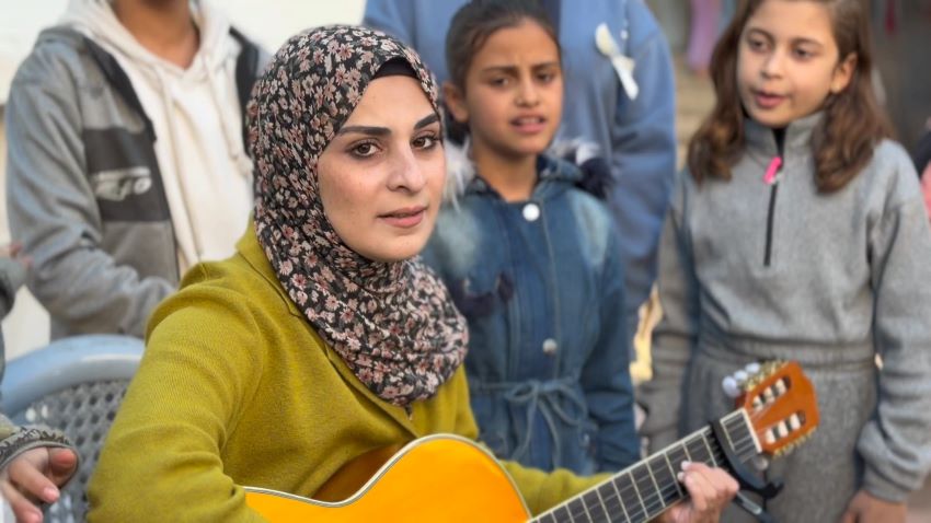 في ركنٍ غمره ظلُ شجرةٍ معمّرة تتوسط خيام النازحين في حديقة جمعية الشبان المسيحية غربي مدينة غزة، كانت خيوط الشمس تتسلّل برفقٍ بين الأوراق، لتضيء وجه الشابة رولا دلول وهي تضبط أوتار آلة الجيتار، بينما تجّمع الأطفال حولها في حلقةٍ صغيرة استعداداً لفصل جديدٍ من الغناء للحب والحياة والسلام.