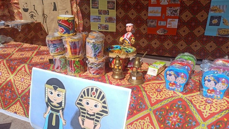 أطعمة، وحلويات، وعصائر، وبهارات، وأزياء تختص بها كل دولة من دول العالم، هنا الأهرامات وأبو الهول، وهناك المسفن الفلسطيني، والخيمة البدوية، وهناك أطفالٌ يؤدون الدّحية، وهذا مجسم لبرج إيفل، وآخر لتاج محل، وملابس للفراعنة، والهنود الحمر معروضة على الجدران، وتمر الكويت وقهوته، والكثير من معالم الثقافات المتباينة، التي كُتب على أطفال غزة أن يحرموا من التعرف عليها بحكم الحصار المفروض منذ ما يزيد على 17 عامًا.