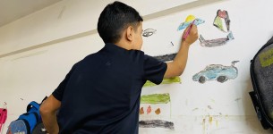 على جدار الفصل الدراسي رسم مصعب رموزًا وطنيةً وعلم فلسطين، وكأنه يقهر بموهبته الاحتلال، ويقول بألوان العلم الأربعة وليس بلسانه، ما قاله الشاعر الراحل محمود درويش: "على هذه الأرض ما يستحق الحياة.