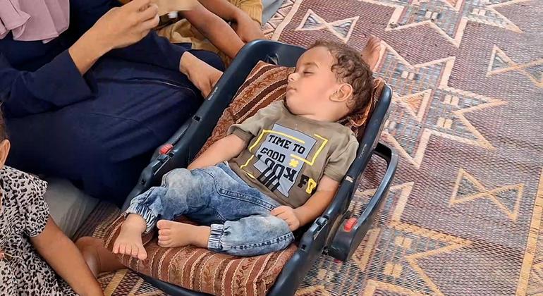 تقيم أسرة عبد الرحمن في أحد مخيمات النازحين غربي مدينة دير البلح وسط القطاع، ووفقًا لوالدته نيفين، فإن رضيعها أصيب بالشلل في الجزء السفلي من ساقه اليسرى، وفق نتائج العينة التي أرسلت إلى الأردن.