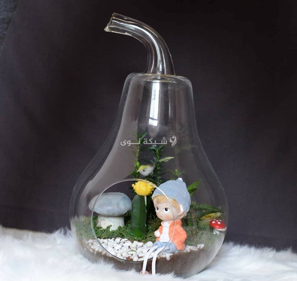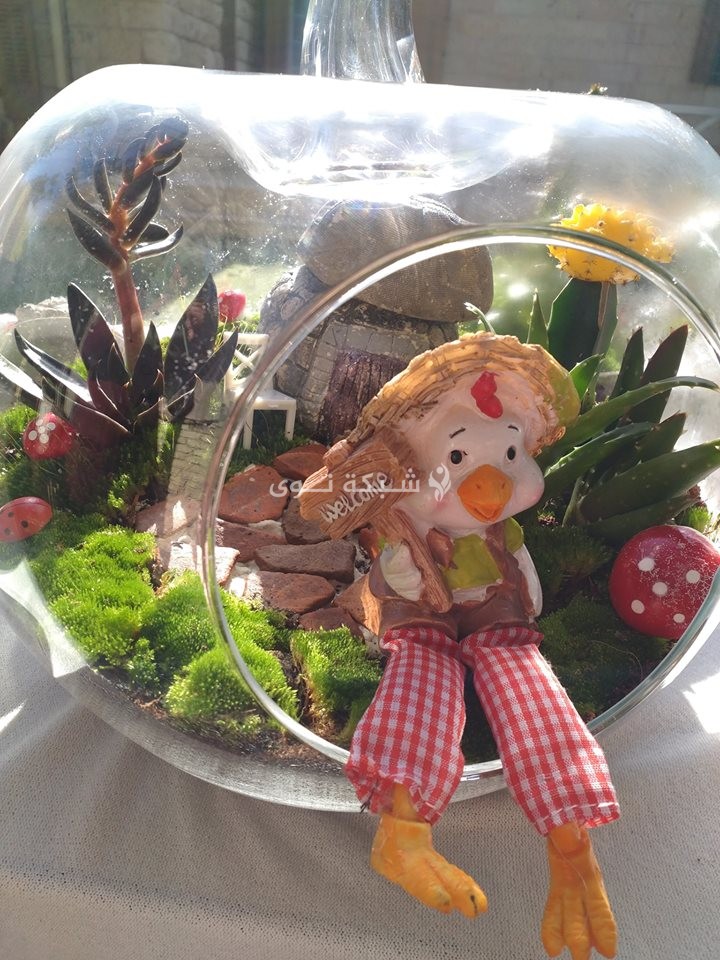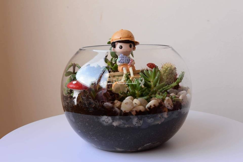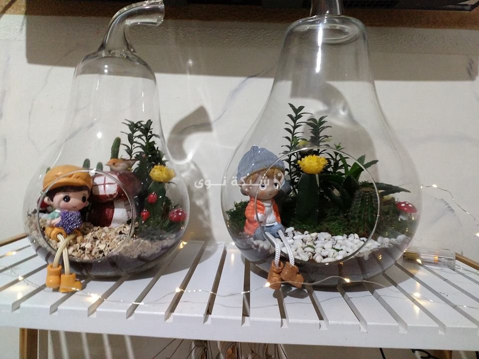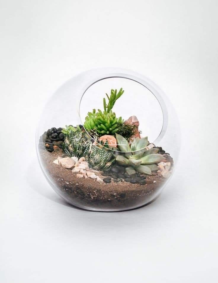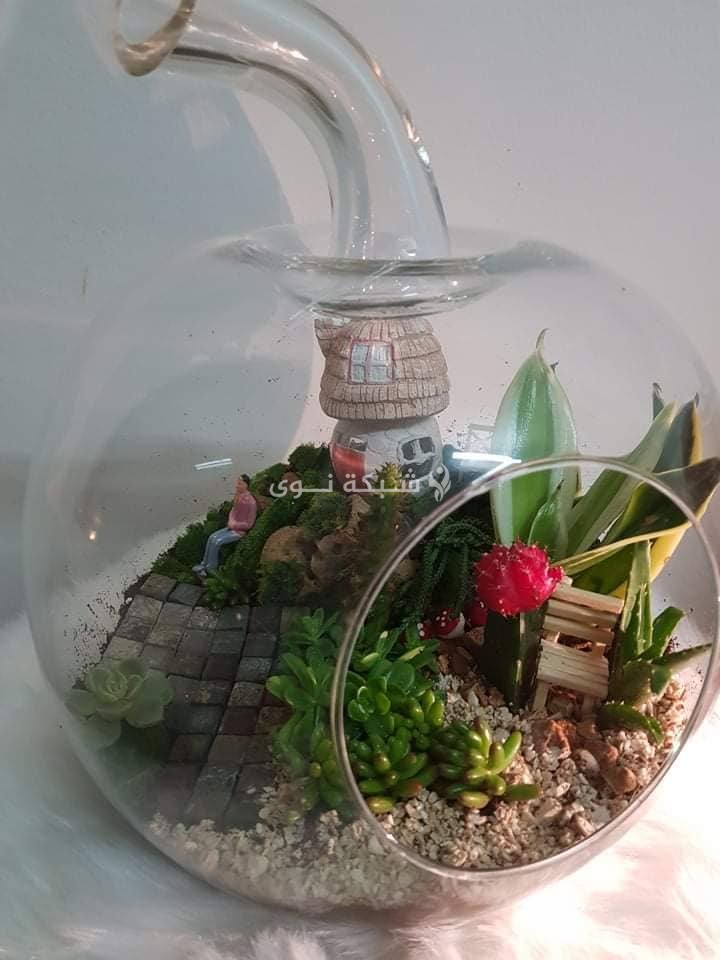نباتات من الصبار لا تختلف شيئاً عن غيرها سوى أن مظهرها الأخضر نُسّق بطريقة مختلفة داخل أوانٍ زجاجية أو فخارية مختلفة الشكل والحجم، وزينت بديكورات متنوعة لوضعها في المنزل أو المكتب وأماكن أخرى.